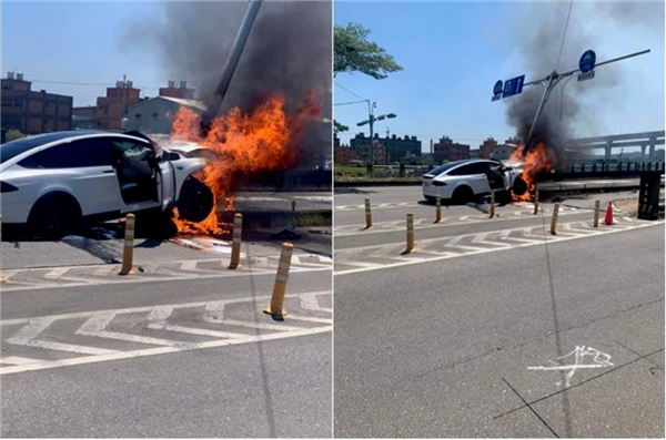 从监视器画面可以看到,林志颖先是缓缓在路口回转后,便一路继续向前行驶,不料却在前方路口因不明原因突然偏离车道自撞指示杆,整辆车的车头很快也陷入火海,情况相当危急。好在有经过的好心人将他们成功救出。